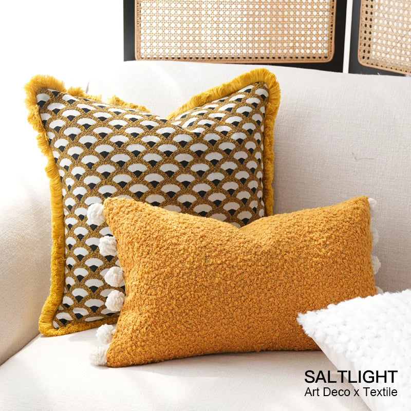 Bring a touch of modern retro charm to your home with this yellow and gold geometric cushion cover, designed to add both texture and style to any space. The bold geometric pattern combines warm golden tones with a soft yellow base, creating a striking yet balanced aesthetic that complements both contemporary and mid-century interiors.