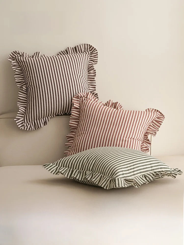 The delicate ruffled edging adds a gentle decorative accent, making these cushion covers perfect for layering on sofas, beds, or reading nooks. Their timeless striped design blends seamlessly with both classic and contemporary interiors.